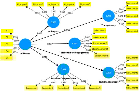 Similarly, Institutional Theory (Scott, 2014) [49] is useful for interpreting the strong influence of AI on stakeholder engagement (R2 = 0.681) and executive compensation (R2 = 0.684). These findings reflect how Jordanian firms are responding to normative and regulatory pressures to adopt globally recognized governance practices. The high path coefficients observed in the SEM model between AI and both Stakeholder Engagement (0.967) and Executive Compensation (0.915) suggest that AI is not only a technical enabler but also a strategic response to institutional demands for greater legitimacy, accountability, and transparency.