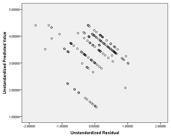 Finally, a scatter plot of residuals against predicted values was generated to examine homoscedasticity. The visual inspection of the plot does not show a clear funnel shape or systematic pattern, indicating that the assumption of homoscedasticity holds. This suggests that residual variances remain consistent across all levels of predicted values. Figure 2 Illustrates this result.