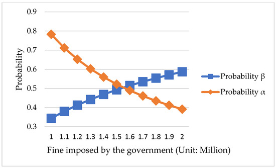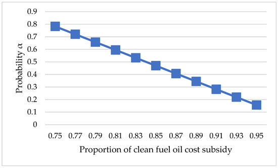 First, in accordance with Equations (4) and (6), the inspection probability of government (α) can be obtained and is shown as α = (b − c)/d and α ∈ [0, 1], where b is the increased cost of the ship using oil in compliance with the law, c is the enterprise subsidy of government, and d is the fines imposed by the government.
