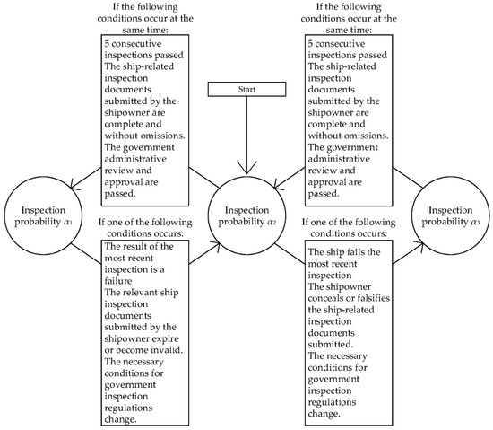 - For ships with an inspection probability of α1, if one of the following conditions occurs: the result of the most recent inspection is a failure, the relevant ship inspection documents submitted by the shipowner expire or become invalid, the necessary conditions for government inspection regulations change, etc., then the inspection probability of the ship will be adjusted to α2.