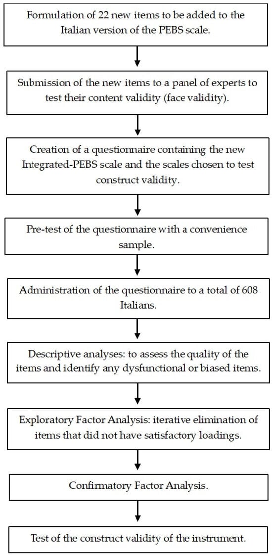 The methodology used and the steps followed to integrate the Italian version of the PEBS scale, develop the Integrated-PEBS (I-PEBS), and test its factorial structure and validity are summarized in Figure 1.