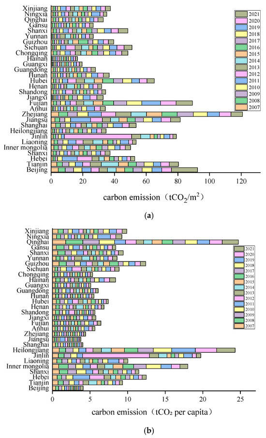(a) Cumulative annual per capita carbon emissions per unit in each province. (b) Cumulative carbon emissions per unit of floor area by province.