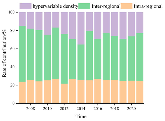 China’s provinces are divided into four regions: Eastern, Central, Western, and Northeastern [54]. As shown in Figure 6, which depicts the spatial distribution of CE, CE has been steadily increasing. The Eastern region exhibits significantly higher emissions than the other regions, while the Western region has the lowest emissions. Thus, Hypothesis 1 is verified and clearly holds. However, within the Western region, Sichuan Province shows a relatively high construction-related CE value. In 2012, Jilin Province had the highest CE, primarily because of the widespread utilization of construction materials. Given the substantial CE, implementing effective measures to reduce its environmental impact is crucial for achieving the goal of sustainable development at the earliest opportunity. This study further applies to the Dagum Gini coefficient decomposition model to examine CE across different regions. As shown in Figure 7, after model decomposition, the figure clearly illustrates that inter-regional disparities are the main factors driving spatial variations in CE.