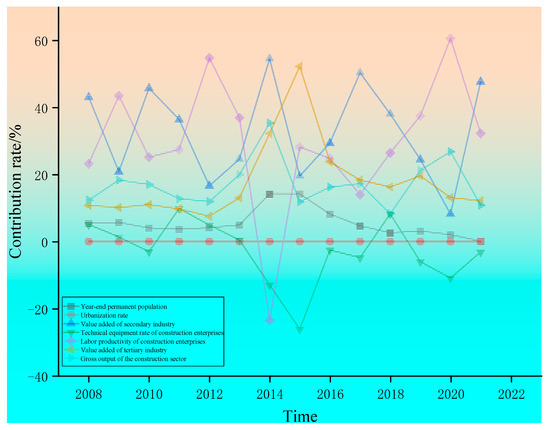 According to the information presented in Figure 9, during the entire life cycle, the contribution rates of (V) and (P) are substantial, revealing the dominance of energy-intensive industries in the current economic landscape. This indicates that the rise in CE is primarily caused by significant energy consumption in secondary industry, while the enhancement in (P) partially reflects technological advancements and improved efficiency. Conversely, it also signifies growth in the construction scale and a rise in the usage of building materials, thereby exacerbating CE.