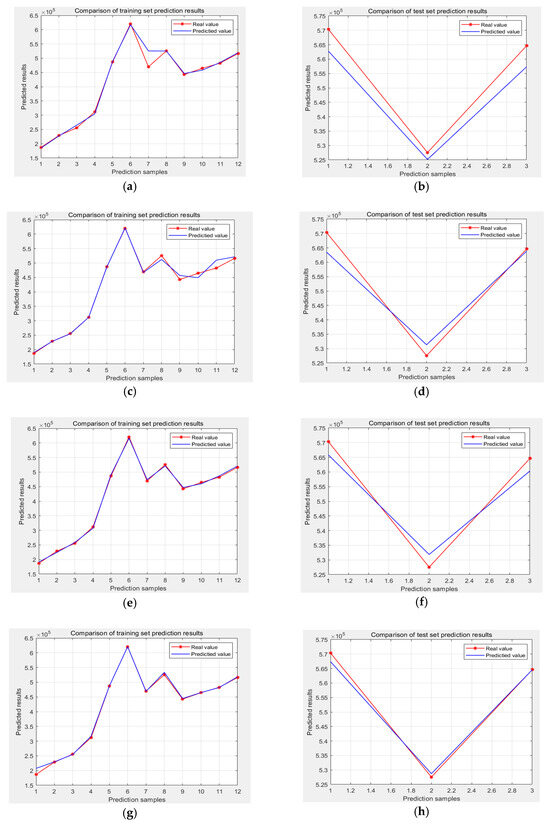 Comparison of the model results. (a) Comparison of real and predicted values of BP neural network training set. (b) Comparison of real and predicted values of BP neural network test set; (c) Comparison of real and predicted values of GM-BP neural network training set; (d) Comparison of real and predicted values of GM-BP neural network test set; (e) Comparison of real and predicted values of SVM training set; (f) Comparison of real and predicted values of SVM test set; (g) Comparison of real and predicted values of GA-BP neural network training set; (h) Comparison of real and predicted values of GA-BP neural network test set.