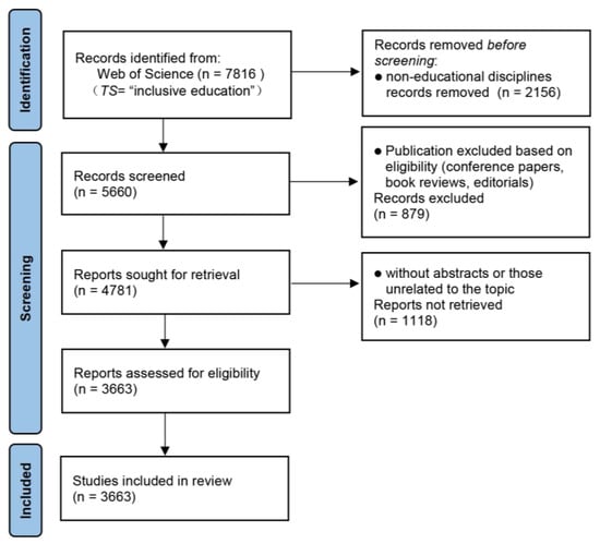 Exclusion criteria included the following: (1) records belonging to non-educational disciplines; (2) conference papers, book reviews, editorials, and other non-research publications; (3) duplicate records or those missing essential metadata; and (4) articles unrelated to inclusive education, as determined through manual screening of titles and abstracts.