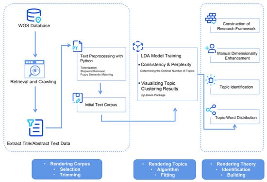 The analysis involved several stages: retrieving relevant literature from the WOS database, preprocessing the data, applying LDA topic modeling, visualizing topic clusters, deriving topic word distributions, and preliminarily identifying topics. Finally, manual coding and classification were used to develop a comprehensive research framework for inclusive education. As illustrated in Figure 2, the analytical process consists of three main components: the corpus, the topics, and their theoretical interpretations.