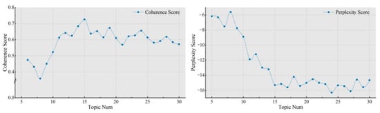 Before conducting the LDA topic analysis, the optimal number of topics (K) must be determined to ensure model accuracy. After importing the research data, Python (https://www.python.org/) code was used to calculate coherence and perplexity scores for models ranging from 5 to 30 topics, resulting in 25 candidate models. As shown in Figure 4, the coherence value peaks at K = 15. Although perplexity continues to decrease with an increasing number of topics, the rate of decline slows significantly after K = 15, showing only minor fluctuations. Therefore, this study adopts K = 15 as the optimal number of topics.