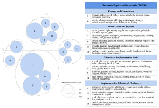 Two authors conducted an initial round of coding for the 15 topics, based on the probability distributions of topic terms, the distances between topics in the LDA topic map (Figure 5), and their understanding of inclusive education. A second round of coding was carried out by two doctoral candidates in education. Any discrepancies were resolved by consulting a third expert to reach a consensus. Although no formal statistical inter-coder reliability was calculated, coding disagreements were discussed and resolved through this consensus process, ensuring consistency and thematic validity. Ultimately, based on visual mapping distances, keyword semantics, and manual coding, five thematic clusters of research were identified.