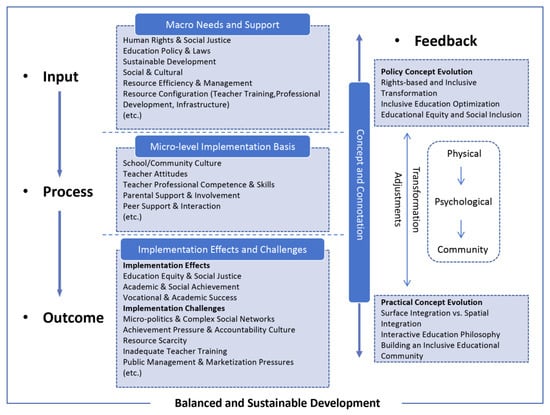 This study introduces a feedback mechanism to highlight the dynamic relationship between the evolution of inclusive education and its development. The model allows for interactive adjustments between policy and practice, keeping it adaptable. At the policy level, inclusive education has shifted from addressing special educational needs to embracing all learners, optimizing special education provisions, and pursuing broader goals of educational equity and social inclusion. At the practice level, it has evolved from physical integration in learning spaces to fostering interaction and a sense of community, ensuring that every student receives adequate support for holistic growth. The progression from “Physical” to “Psychological” to “Community” reflects a shift from passive compliance with policy mandates to active social commitment. These feedback loops enable educational systems to remain responsive to societal changes, sustaining equilibrium and the capacity to meet diverse learning needs.