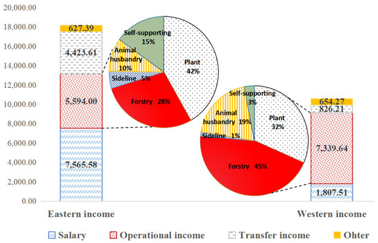 Regarding regional variation characteristics in forest farmers’ participation in SPC, artificial forests predominate in the Western region, fostering a greater aspiration for forest ranger roles, whereas other metrics favor the Eastern region. The Hu line, a demographic demarcation dividing China into Southeast and Northwest zones, historically boasts economic prosperity, dense populations, ample resources, and favorable climates in the Southeast [40]. Consequently, the Eastern region exhibits higher levels of education, health standards, self-preventive measures, engagement with socialized enterprises, adoption of forest insurance, organizational efficacy of village committees in SPC, and anticipation for forest ranger incomes compared to the Western region. Factors like population migration and trade infrastructure contribute to increased occurrences and risks of pests and diseases in the Eastern region [61]. Conversely, the Western region is characterized by vast expanses of sparsely populated land, arid climates, and relatively lower economic development than the East. The disparity in annual incomes of forest farmers between the East and West is depicted in Figure 2, with Eastern farmers earning notably higher incomes. Eastern forest farmers augment their earnings through off-farm employment, such as factory work, while their Western counterparts rely more on operational revenue, with forestry constituting up to 45%. Limited alternative income avenues, such as migrant labor, prompt Western forest farmers, particularly those experienced in self-preventive practices and encouraged by village committee initiatives, to pursue forest ranger roles to bolster household incomes.