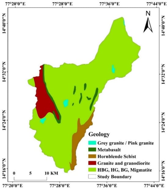 Geology plays a significant role in determining groundwater potential, as it directly influences subsurface permeability, porosity, and aquifer storage capacity. In the RF model, geology is integrated as a key predictor variable, helping to classify GWPZs based on lithological characteristics (Figure 3). The study area comprises hard rock terrains, including hornblende–biotite gneiss, hornblende gneiss, biotite gneiss, and migmatite, which exhibit low porosity and permeability, leading to limited groundwater recharge. These formations were assigned lower importance in the RF classification due to their restricted water-holding capacity. In contrast, granite/granodiorite formations in the southwestern region contain structural fractures and lineaments, enhancing secondary permeability. These features contribute to moderate groundwater storage and have been assigned higher importance in the model. Similarly, meta-basalts and schists in the southeastern regions exhibit variable permeability based on their degree of weathering. The RF model effectively identifies the influence of different lithological units in groundwater potential mapping, offering an objective, data-driven approach compared to traditional AHP-based weighting. The integration of geology with other hydrogeological parameters enhances the predictive accuracy of the model, providing a robust framework for groundwater resource assessment in the Pandameru River Basin.