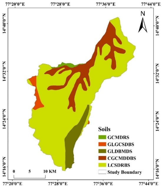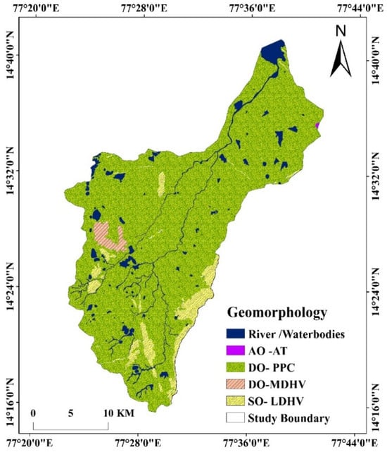 Soil properties significantly influence groundwater recharge, infiltration, and retention, making them crucial for RF-based groundwater potential mapping. The RF model leverages soil characteristics as predictive variables, assessing their impact on groundwater availability in a data-driven manner. The study area exhibits diverse soil types associated with low dissected hills, valleys, and pediment–pediplain complexes, each contributing differently to groundwater dynamics. Key soil parameters such as porosity, permeability, infiltration rate, and water retention capacity serve as important predictors in the RF classification process. Pediment–pediplain soils (denudational origin) exhibit moderate infiltration potential due to their compact nature, making them moderately significant for groundwater recharge. Soils in structural origin terrains (low dissected hills and valleys) have lower permeability, leading to limited groundwater retention (Figure 5). Anthropogenically influenced soils show compaction and altered drainage, affecting natural recharge patterns. By integrating soil characteristics with other geospatial parameters, the RF model enhances classification accuracy, ensuring robust predictions for GWPZs. This approach enables scientifically informed water resource management, facilitating effective groundwater conservation strategies in the Pandameru River Basin.