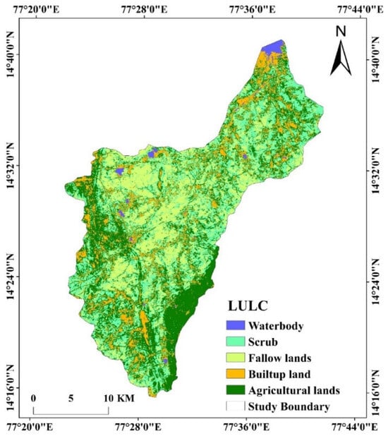 LULC plays a critical role in determining GWPZs, as different land-use types influence infiltration, runoff, and groundwater recharge. In this study, the RF model was employed to classify LULC and assess its impact on groundwater potential. Using RS and GIS techniques, the study area was classified into five major LULC types (Figure 9): waterbodies (1.16%)—high infiltration and recharge capacity; agricultural lands (32.41%)—moderate recharge potential, influenced by soil type and irrigation practices; built-up land (14.36%)—low infiltration, high runoff due to impervious surfaces; scrub (31.7%)—moderate infiltration, depending on vegetation density; and fallow lands (20.27%)—variable recharge potential, influenced by soil permeability and topography. The RF model assigned higher importance to waterbodies and agricultural lands due to their significant contribution to groundwater recharge. Conversely, built-up areas received lower importance due to reduced infiltration. The scrub and fallow lands were identified as potential sites for rainwater-harvesting (RWH) structures, supporting groundwater conservation efforts. By integrating LULC classification with RF-based groundwater potential mapping, this study provides a data-driven approach for effective water resource planning in the Pandameru River Basin.