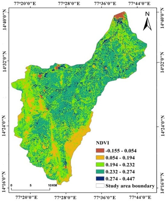 Vegetation plays a significant role in groundwater recharge by enhancing infiltration and reducing surface runoff. The NDVI is a widely used spectral indicator that assesses vegetation health and density, derived from the red and near-infrared (NIR) bands [38]. In this study, RF modeling was applied to integrate NDVI with other hydrogeological parameters for GWPZ mapping. The NDVI values for the Pandameru River Basin were classified into five categories (Figure 10): −0.155 to 0.054—barren or water surfaces (low infiltration); 0.054 to 0.194—sparse vegetation (moderate infiltration); 0.194 to 0.232—open scrublands (moderate recharge potential); 0.232 to 0.274—agricultural land with healthy vegetation (high recharge potential); 0.274 to 0.447—dense vegetation and forested areas (significant groundwater recharge). The RF model was trained using NDVI values alongside other key factors such as LULC, slope, lineament density, and drainage density to enhance groundwater potential predictions. NDVI contributes to the RF classification model by identifying areas with high vegetation cover, which correlates with greater groundwater infiltration. Higher importance was assigned to NDVI values above 0.232, indicating agricultural lands and dense vegetation, which enhance groundwater recharge. Lower importance was assigned to NDVI values below 0.054, representing barren lands and built-up areas, where infiltration is minimal. By integrating NDVI with RF-based groundwater potential mapping, this study provides a data-driven approach to identifying zones with high groundwater recharge potential, supporting sustainable water resource management in the Pandameru River Basin.