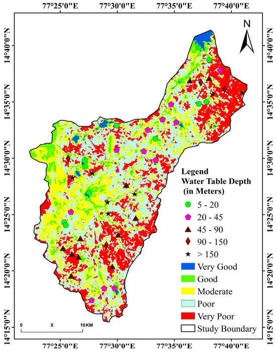 The GWPZs identified within the Pandameru River Basin underwent thorough verification. This process involved analyzing data from 46 strategically positioned observation wells that spanned the entire study area (Table 7). The primary focus of this analysis was on the water levels present in these wells, serving as crucial indicators of the potential for groundwater availability [42,43]. By considering both piezometer readings and data collected during field surveys, a wide spectrum of water availability within the Pandameru River Basin was revealed, ranging from 5 m to well over 150 m [44]. To comprehensively classify these ranges, they were segmented into five distinct categories based on the GWPZ mapping classification: Very Good Potential Zone—5 to 20 m, Good Potential Zone—20 to 45 m, Moderate Zone—45 to 90 m, Poor Zone—90 to 150 m, Very Poor Zone—greater than 150 m from the surface. Among the 46 observation wells, the distribution within these zones was as follows: Very Good Zone (5–20 m)—11 wells, Good Zone (20–45 m)—12 wells, Moderate Zone (45–90 m)—11 wells, Poor Zone (90–150 m)—4 wells, and Very Poor Zone (>150 m)—7 wells (Figure 12). This noticed divergence was mostly due to the nearness of these boreholes to densely inhabited areas or areas with extensive farming operations. These are situations in which groundwater exploitation is very high. The Pandameru River Basin groundwater potential zone map was estimated to be 86% accurate. This level of precision is consistent with the results of previous examinations. These findings show the method’s inaccuracy in identifying regions with potential for groundwater retention and extraction within the basin. The mapping results’ excellent accuracy underscores their crucial role in ensuring the efficient and successful governance of groundwater resources across the region. The cross-validation of possibilities for groundwater regions using observation well data proves the zoning approach’s dependability and applicability. This method has enormous potential to make a significant contribution to the sustainable management of groundwater in the Pandameru River Basin.
