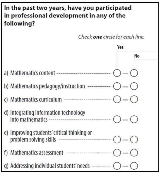 Item-responses on participation in professional development in the Trends in International Mathematics and Science Study (TIMSS) 2011 Teacher Questionnaire [45]. Source: TIMSS 2011 Assessment. Copyright © 2009 International Association for the Evaluation of Educational Achievement (IEA). Publisher: TIMSS & PIRLS International Study Center, Lynch School of Education, Boston College.