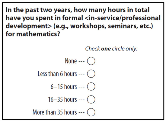 The 2015 and 2019 TIMSS included an additional item to collect self-reported hours spent in PD (BTBM25 in 2015 and BTBM23 in 2019; see Figure 2); in these cases, we created the dependent variable for each teacher from their responses to these items, assigning a value of 1 if they checked the circle “None”, and 0 if they selected any of the remaining options.
