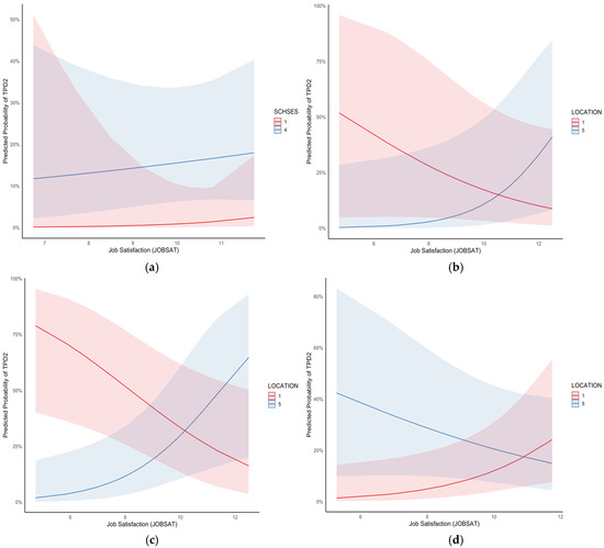 Figure 3 illustrates the four cases where interactions between the teachers’ job satisfaction and the variables at the school level (i.e., location and SES) significantly explained non-participation in PD. Each graph shows the predicted probability of this outcome in the vertical axis and the values of the job satisfaction scale in the horizontal axis. Colored lines represent the two extreme values in each school level predictor: for location these corresponded to 1 = “Urban–Densely populated” (red color) and 5 = “Remote rural” (blue color), and for SES lines represented 1 = “High” (red color) and 3 = “Low” (blue color). The shaded areas depict 95% confidence intervals of estimation.