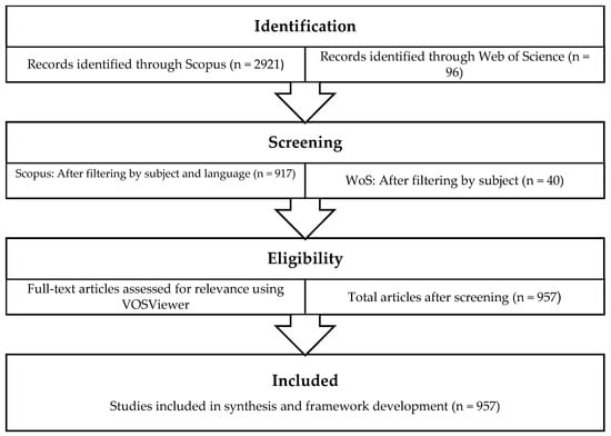For Scopus, the search was conducted in March 2025, limited to the years 2015–2025. From an initial 2921 documents, filtering by subject areas and language reduced the results to 917, as shown in PRISMA, Figure 1 below. For Web of Science, the search followed a similar approach but focused on article-type documents published between 1986 and 2025. It first retrieved 96 documents and then narrowed them to 40 after refining them by subject areas like Business Economics, Environmental Sciences, Ecology, Energy Fuels, and Construction Building Technology. In both cases, relevant articles were selected and analyzed using VOSViewer 1.6.20 software for bibliometric and network analysis to identify research trends, subject categories, and countries and create visual maps [56]. The software enabled co-occurrence analysis of keywords and citation analysis to highlight influential research, providing valuable insights into existing gaps and trends in the field. This structured methodology ensures a credible, data-driven foundation for developing a framework that strengthens academia–industry collaboration and improves research and innovation integration in sustainable construction.