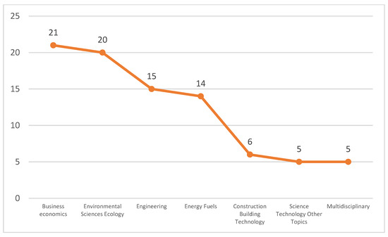 Figure 3 and Figure 4 show the analysis of Web of Science (WoS) and Scopus subject areas, revealing that sustainable building research is heavily focused on technical and environmental aspects rather than economic or policy-driven discussions. In WoS, the highest number of publications appears in Business Economics (21) and Environmental Sciences (20), showing interest in both financial feasibility and ecological impact. Meanwhile, Scopus shows a much higher volume of research due to broader keywords in Environmental Sciences (417), Engineering (406), and Energy (379), indicating a strong emphasis on scientific and technological advancements in sustainable construction. The significant difference in research volume between economic and technical subjects suggests a gap in integrating business strategies with scientific innovations.