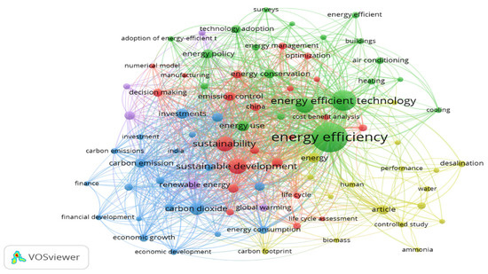 Figure 5 presents an analysis of research clusters related to sustainable building, grouped into five thematic areas: Adaptation (Red), Technology (Green), Transformation (Blue), Sustainability (Yellow), and Policy (Purple). Each cluster highlights key themes and research focuses that contribute to the overall discussion on academia–industry partnerships in sustainable construction. Cluster 1 (Red)—Adaptation focuses on energy efficiency, climate change, and cost-effectiveness in the construction industry. Research in this cluster emphasizes decision-making, cost-benefit analysis, emission control, and energy management, highlighting efforts to reduce greenhouse gas emissions and improve sustainability in construction practices [60]. This cluster aligns with studies on how industries adopt energy-efficient technologies to reduce their environmental impact [6,14]. Cluster 2 (Green)—Technology explores technological advancements in energy efficiency, including air conditioning, energy conservation, and energy-efficient technologies. The focus is on the practical applications of new building technologies, such as heating, cooling, and housing innovations, which contribute to more energy-efficient construction practices [61]. This cluster represents research on how academia and industry can collaborate to develop and implement new technologies that enhance sustainability in the built environment.