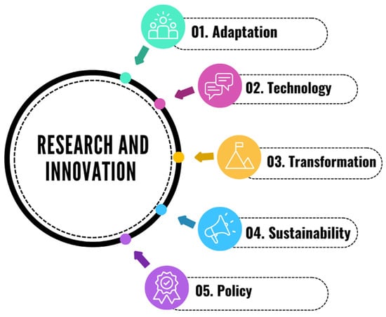 Based on the five themes obtained from the bibliographic data, all the elements work together to drive change. Adaptation is closely connected to technology, transformation, sustainability, and policy because it helps industries and societies adjust to new advancements and changes [65]. Technology helps industries and societies adapt by introducing new tools, energy-efficient systems, and smart innovations that improve efficiency [66]. This leads to transformation, where businesses and industries shift from old methods to more advanced, sustainable practices [67]. Sustainability plays a key role in adaptation because industries must adjust to climate challenges, resource limitations, and environmental regulations to ensure long-term growth [68]. However, successful adaptation is only possible with strong policies that guide industries toward adopting new technologies, encourage transformation, and promote sustainable practices through regulations, incentives, and strategic planning [69]. Together, adaptation, technology, transformation, sustainability, and policy create a cycle of progress, helping industries evolve and meet modern challenges effectively. The theories supporting this are discussed below, along with the implications.