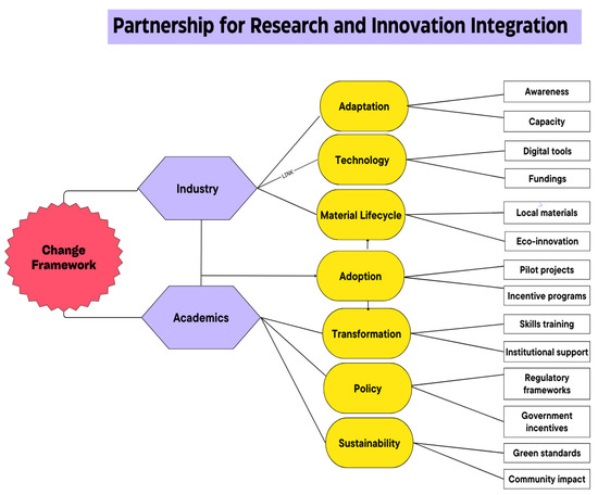 The findings highlight that adaptation theories are essential for strengthening academia–industry collaboration in sustainable building in sub-Saharan Africa. A learning-by-doing approach allows the construction industry to gradually integrate sustainable technologies, making partnerships more flexible and innovative. Sharma et al. [89] explained that the adoption of energy-efficient materials and digital tools like BIM depends on economic factors, organizational readiness, and external pressures, meaning academia must support the industry through cost-effective solutions and training. Adapting to climate risks, economic shifts, and policy changes requires a structured change framework that helps industries absorb shocks and reorganize effectively. Toșa et al. [90] emphasized that while some companies quickly embrace sustainability, others resist change, highlighting the need for awareness programs, incentives, and policy support to speed up adoption. Strong government policies and industry standards play a key role, as businesses often adopt sustainable practices due to regulations, certifications, and social expectations rather than just financial benefits. By applying these adaptation theories, this study presents a framework that improves academia–industry collaboration, encourages innovation adoption, and supports policy-driven sustainability in construction.