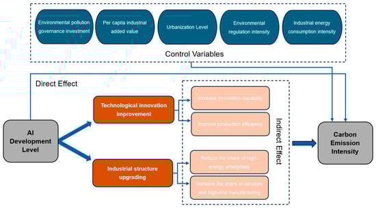 AI dramatically reduces carbon emission intensity through a variety of paths, according to empirical data from its implementation in energy consumption and carbon emission intensity management practices. These include optimizing carbon emission management strategies, enhancing energy conservation, reducing emissions, and improving energy utilization efficiency [24,27]. Furthermore, existing studies reveal that the impact of AI development level on carbon emission intensity exhibits pronounced heterogeneity. This heterogeneity enables policymakers and managers to implement tailored energy-saving and emission-reduction strategies based on regional disparities in AI-driven carbon emission control, thereby further reducing carbon emission intensity [28,29,30]. Based on the theoretical analysis above, this study posits the following hypothesis: