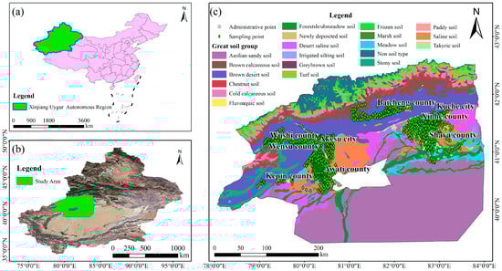 Overview maps of the (a) Xinjiang Uygur Autonomous Region and (b) study area. (c) Data sampling points.