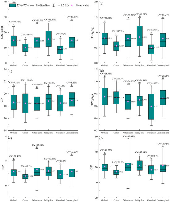 Descriptive statistics of soil C, N, and P, and other indicators and their ecological stoichiometric characteristics ((a–f) are soil SOC, TN, C/D, TP, N/P, and C/P mathematical and statistical characteristics, respectively; Numbers a and b represent significant differences).