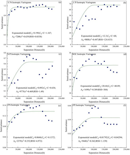 Semi-variogram of the soil C:N ratio (a), C:P ratio (b), N:P ratio (c), and contents of SOC (d), TN (e), and TP (f) in the Aksu region.