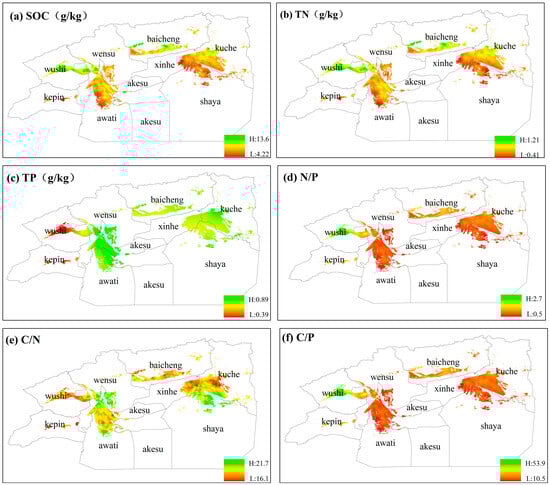 Spatial distribution of SOC, TN, and TP, contents and C:N, C:P, and N:P ratios in the Aksu region.