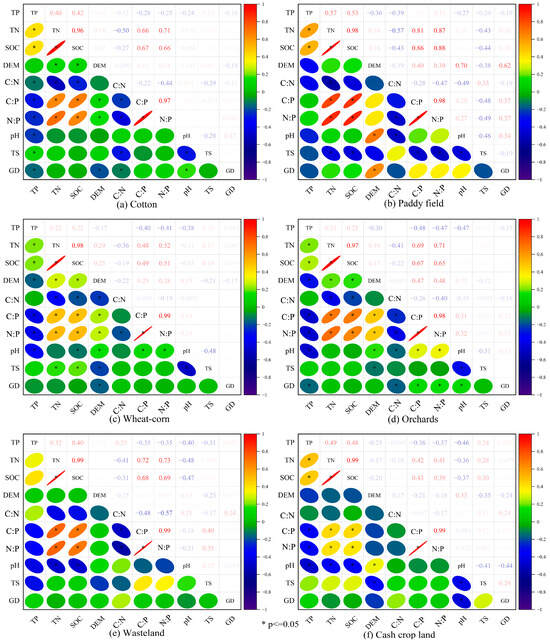 Orchards: Elevation was the key factor affecting SOC and TN, while C:P and N:P ratios were closely linked to pH and elevation. TP exhibited significant correlations with pH, elevation, and groundwater depth. Wheat–maize systems: SOC, TN, TP, and stoichiometric ratios (C:N, C:P, and N:P) were all significantly influenced by elevation. TP and C:N ratio showed significant negative correlations with elevation, while only TP was negatively correlated with pH. Cotton fields: SOC, C:N, and C:P ratios showed no significant correlations with elevation, pH, or groundwater depth. TN positively correlated with elevation, whereas TP negatively correlated with pH and groundwater depth. Paddy fields and wasteland: No significant correlations were observed between soil parameters and environmental factors. Other systems: Only TP exhibited a significant correlation with elevation. Comprehensive analysis identified soil pH and elevation as the primary drivers of SOC, TN, and C:N ratio variability across all six cropping systems.