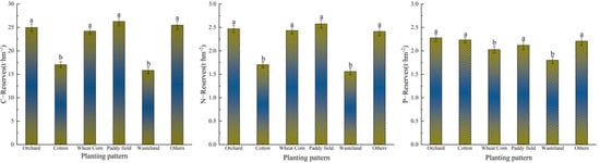 Based on soil bulk density data from the Aksu region (2020), average values for orchards, cotton fields, wheat–maize systems, paddy fields, other systems, and wasteland were 1.441, 1.444, 1.44, 1.457, 1.459, and 1.456 g cm−3, respectively. Surface soil C, N, and P stocks were calculated accordingly (Figure 6). The mean surface soil C stock was 22.31 ± 10.37 t hm−2, ranked as paddy fields (26.28 t hm−2) > other systems (25.49 t hm−2) > orchards (24.98 t hm−2) > wheat–maize (24.21 t hm−2) > cotton fields (17.06 t hm−2) > wasteland (15.84 t hm−2), with significant differences (p < 0.05) between cotton/other systems and the remaining four. Mean N stock (2.20 ± 1.07 t hm−2) followed paddy fields (2.58 t hm−2) > orchards (2.47 t hm−2) > wheat–maize (2.43 t hm−2) > other systems (2.41 t hm−2) > cotton fields (1.71 t hm−2) > wasteland (1.56 t hm−2), where cotton and wasteland differed significantly (p < 0.05) from others. Mean P stock (2.21 ± 0.59 t hm−2) showed orchards (2.58 t hm−2) > cotton fields (2.47 t hm−2) > other systems (2.43 t hm−2) > paddy fields (2.41 t hm−2) > wheat–maize (1.71 t hm−2) > wasteland (1.56 t hm−2), with wheat–maize and wasteland significantly lower (p < 0.05). These results highlight pronounced anthropogenic impacts on surface soil nutrient stocks across land-use types.
