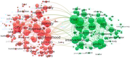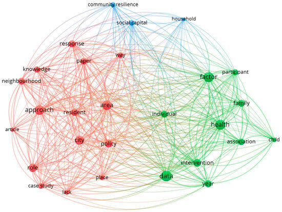 Researchers underline the specific context in which the challenges of social resilience must be addressed. The world of today is fragile, anxious, nonlinear, and incomprehensible, as described by Mahadevan [51] in the BANI environment (Brittle, Anxious, Nonlinear, and Incomprehensible). The previous VUCA (Volatile, Uncertain, Complex, and Ambiguous) paradigm is being replaced by this new era, which emphasizes the necessity of a new management and leadership style. For example, the recent pandemic has raised additional questions and challenges in the field of strengthening social resilience [52]. The ability of social entities—whether they are people, organizations, or communities—to withstand, assimilate, manage, and adapt to a variety of environmental and social risks is the focus of all definitions of social resilience [2]. Existing research highlights the importance of fostering strong social connections and networks [53], community solidarity [54], and inclusive governance [55] to enhance resilience. Figure 4 demonstrates the graphical analysis using the VOSviewer (2024) software of the use of terms generated from the bibliometric results of search in the Web of Science’s scientific literature database using the keyword combination ‘strengthening social resilience in neighborhoods’. The graph demonstrates the close integration of three clusters of the use of terms centered around spatial concepts, such as place and city (red color), theory-based research concepts (blue color), and social–demographic terms (green color), suggesting that a balanced interdisciplinary approach is currently emerging in studies focusing on strengthening social resilience in urban neighborhoods.