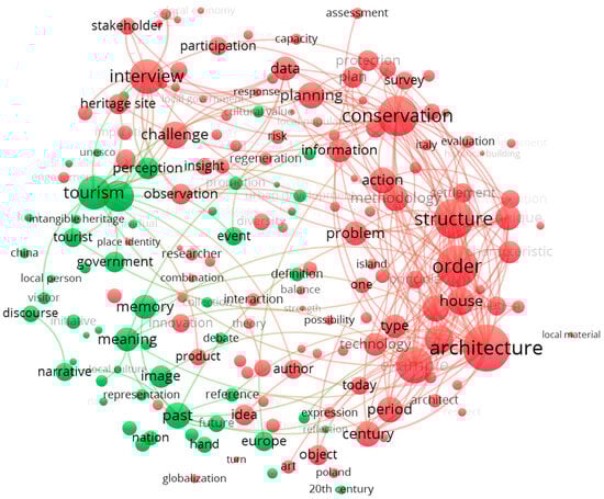 Integrated thematic clusters illustrating connections between architectural, social-participatory, and theoretical approaches to heritage and local identity in the literature. Graph created using the VOSviewer (2024) software.