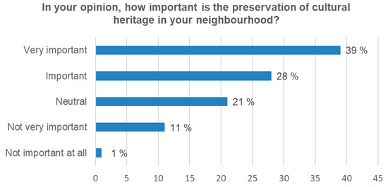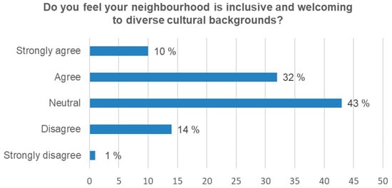 The structure of the questionnaire was based on the conceptual understanding that local identity and social resilience are influenced by residents’ perceptions of cultural heritage, inclusiveness, and diversity. Research on place attachment and cultural sustainability suggests that the recognition of heritage values contributes to a sense of belonging and shared memory, which are foundational to community resilience [10,11]. Similarly, inclusive and diverse neighborhoods are more likely to foster adaptive capacity and mutual support networks, especially during crises or transitions [1,12]. Accordingly, the questionnaire included sections aimed at capturing how residents perceive symbolic and material heritage features, whether they feel their communities are inclusive and welcoming, and how these perceptions relate to broader feelings of empowerment and trust in urban systems.