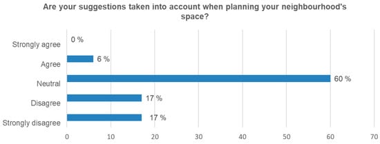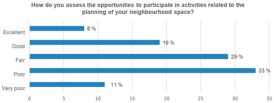 The questionnaire included a dedicated section on community empowerment tools aimed at understanding how residents evaluate their opportunities to participate in neighborhood planning and how they perceive their own roles in shaping urban resilience. This approach reflects the view that community resilience is not only built through physical infrastructure or institutional policies but also through the empowerment of local actors to contribute meaningfully to governance processes [13,14]. Survey items asked residents to identify whether they see themselves as observers, partners, leaders, or passive consumers in planning processes and to assess the responsiveness of formal decision-making structures to their inputs. These indicators offer insights into both the capacity and readiness of communities to participate in building resilience. Measuring these subjective roles and perceptions is essential for identifying barriers to empowerment and for informing more inclusive and effective participatory models at the neighborhood level [15,16].