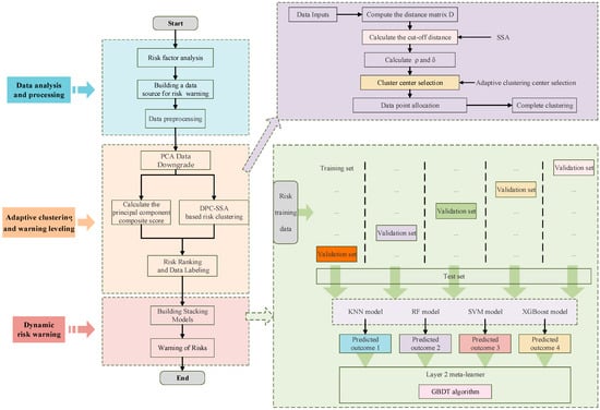 The risk warning stacking model [46] constructed in this paper consists of two layers: base learners in the first layer and a meta-learner in the second layer. The original dataset is divided into equally sized sub-training sets, which are fed to the k base learners in the first layer to train and generate predictions. The second layer then uses the k outputs from the first layer as input data to train the meta-learner, which produces the final identification results. To reduce the risk of overfitting in the ensemble model, cross-validation is applied to the data.