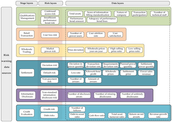 After analyzing the risk factors of electricity sales companies, a risk warning data source is constructed to support subsequent risk warnings. As shown in Figure 3, the risk data source is divided into three layers: stage, risk, and data. The stage layer represents the entire business process of the electricity sales company, while the risk layer captures the associated risks within each stage. The data layer quantifies the risk layer and serves as the direct data source for risk warnings.