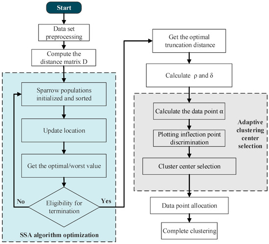 To address this, this paper proposes the DPC-SSA clustering algorithm, which uses the Sparrow Search Algorithm (SSA) to conduct a global search for the truncation distance , reducing manual intervention and enhancing clustering accuracy. Additionally, an adaptive clustering center selection strategy determines the number of clusters and cluster centers. The process of the DPC-SSA clustering algorithm is shown in Figure 5.