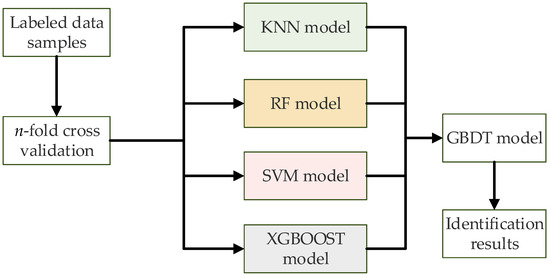 - Selection of meta-learner. To prevent overfitting, the meta-learner should have strong generalization capabilities to effectively refine and optimize the base learners’ predictions. Therefore, Gradient Boosting Decision Trees (GBDT) [51] are selected as the meta-learner for the second layer. The structure of the stacking model is illustrated in Figure 6.