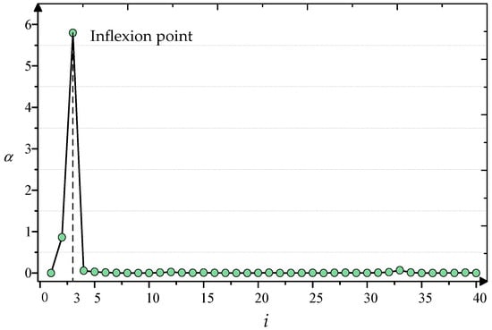 The data points corresponding to the j -values before the inflection point are selected as cluster centers, with the number of cluster centers being j. This strategy is based on the fact that the decision value of the clustering center and the non-clustering center differ greatly. By observing the change trend, the boundary between cluster centers and non-cluster centers is identified when the change rate transitions from rapid to gradual.