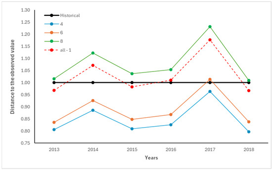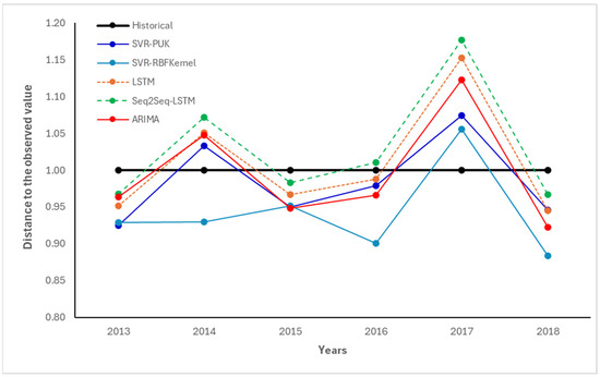 To determine the optimal configuration for the Seq2Seq-LSTM architecture, we tested various sequence lengths. These results, shown in Figure 3, underscore the superiority of deep learning architectures, particularly Seq2Seq-LSTM, for modeling sequential agricultural data. The vertical axis represents the normalized distance to the observed value (actual yield), with the historical data baseline shown in black at a value of 1.0. The lines represent different sequence lengths: 4 years (blue), 6 years (orange), 8 years (green), and all − 1 years (red dashed line), indicating a model trained using all available data except for the target year. Our analysis revealed that using the maximum data sequence provided the best fit for forecasting. The chart illustrates how shorter sequence lengths (4 and 6 years) consistently yielded predictions closer to the observed yields, with distances generally below the historical baseline. These configurations showed greater accuracy, particularly from 2013 to 2016 and again in 2018. The model with 6-year sequences (orange) achieved a strong balance between accuracy and temporal coverage. Conversely, models with longer input sequences (8 and all − 1) tended to deviate more from the observed values, particularly in 2014 and 2017, possibly due to overfitting to long-term trends or sensitivity to early years with different conditions. While the maximum sequence model (all − 1) performed best on average across years, its variability suggests it may not always be ideal for near-term predictions.