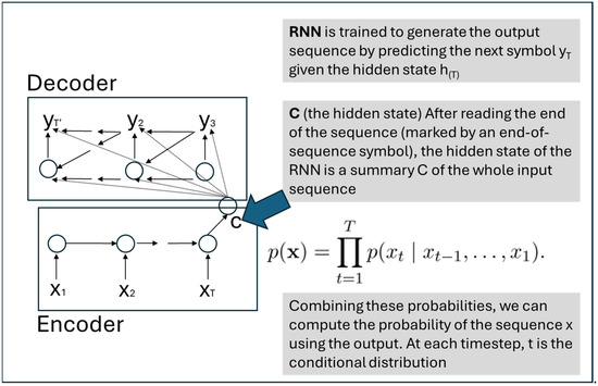 Seq2Seq’s capability to map variable-length sequences to fixed-length vectors and then transform them back into sequences makes it highly suitable for tasks like statistical machine translation. Additionally, the model employs gating mechanisms within its hidden units, inspired by LSTM, to enhance memory capacity and facilitate easier training, thereby enabling better handling of long-term dependencies. The diagram of the Seq2Seq architecture is shown in Figure 2. The foundational structure of Seq2Seq consists of two neural networks: an encoder and a decoder, designed to effectively handle variable-length input and output sequences, respectively. The encoder processes a source sequence and maps it onto a fixed-length vector representation, capturing the relevant information of the input sequence. The decoder then uses this fixed-length vector to generate an output sequence. In the case of natural language processing (NLP), the decoder predicts the following word in the sequence based on the previous word, the previously generated hidden state, and the context vector from the encoder. This process continues until the entire target sequence is generated.