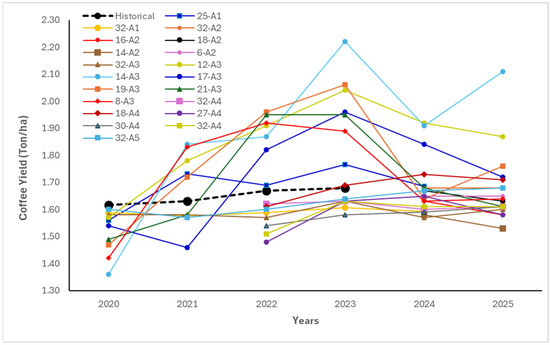 Annual coffee yield predictions (ton/ha) for Chiapas, Mexico, from 2020 to 2025 using multiple Seq2Seq-LSTM and Gaussian model configurations (e.g., 32-A1, 14-A2, and 30-A4), compared against the historical baseline (dashed black line) derived from SIAP and CONAGUA data. Each colored line represents a different model architecture tested across sequence lengths and layer configurations. Predicted yields closely track the historical trend, with minimal deviation observed in most years. Models such as 32-A5 and 25-A1 showed the strongest alignment with historical data. Forecast variability was most notable in 2022–2024, indicating model sensitivity to sequence length and input features. Overall, the validation MAE across the top-performing models remained below 0.05, and RMSE values below 0.07, demonstrating high predictive precision and generalization across multiple-year horizons.