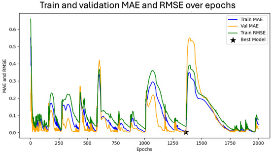 Figure 5 presents the evolution of training and validation metrics across 2000 epochs for the Gaussian LSTM model. The blue line shows the mean absolute error (MAE) on the training set, the orange line represents the MAE on the validation set, and the green line indicates the root-mean-squared error (RMSE) on the training set. The black star marks the epoch at which the model achieved the best validation loss and was selected for inference.