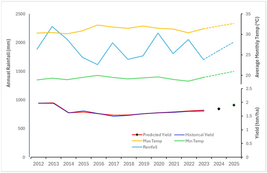 The model demonstrated high accuracy during stable yield periods, such as 2012–2013 and 2019–2023, with predictions closely matching the actual values. Slight underestimations occurred during periods of yield recovery or decline (e.g., 2014–2017), possibly due to nonlinear shifts in agronomic or climatic conditions that were not fully captured by the input features.