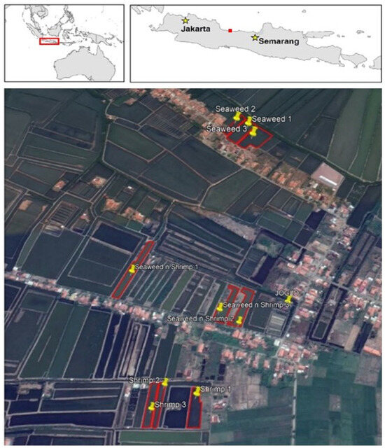 Our co-culture experiments took place in the rural village of Kaliwlingi in the province of Brebes along the north coast of Central Java, Indonesia (6°48′16″ S; 109°2′1″ E) (Figure 1). Nine ponds (sizes: 2000–5000 m2; approximate depths: 75 cm) were chosen based on availability and willingness of three farmers to cooperate. The water of the ponds was drained, the top layer (~15 cm) of pond sediment was removed, and the ponds were left to dry for 7–10 d until the sediment cracked (~20% moisture content) and became odorless [51]. Then, according to common practice, the ponds were treated with Saponin.